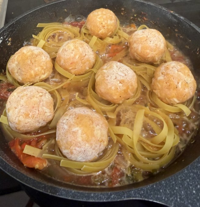 каждого гнезда положите фрикадельку. Залейте все соусом.