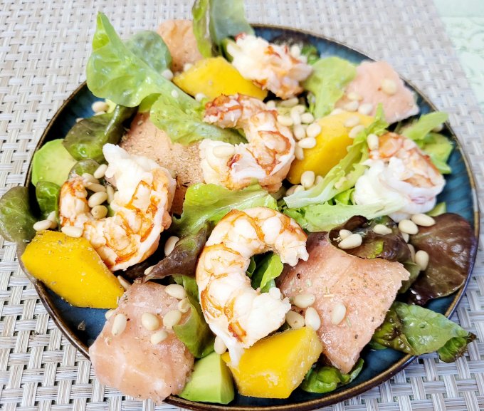 | Салат, авокадо, манго, креветка аргентинская, лосось, кедровые орешки, лимонный сок, французские травы |