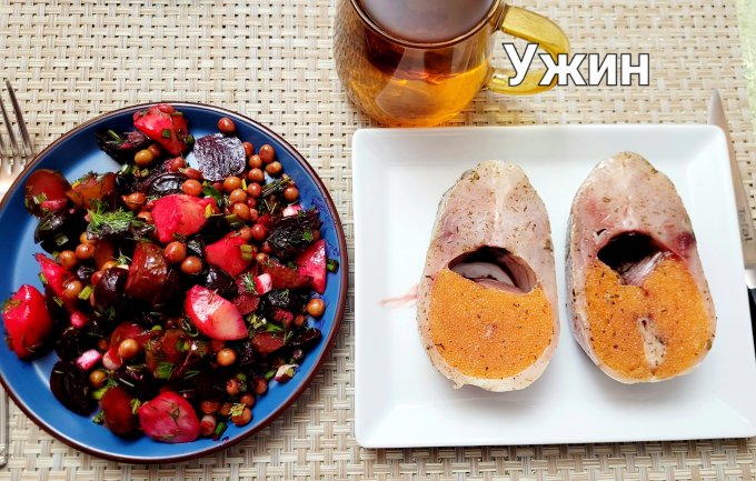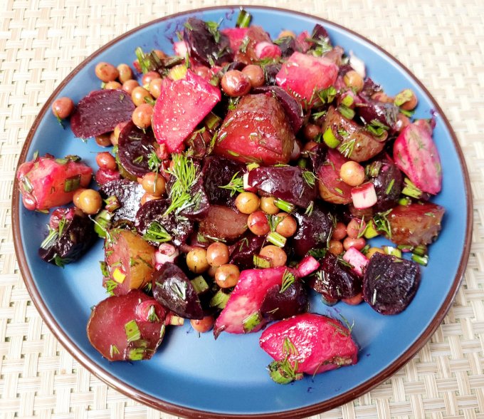 | Винегрет, свекла, огурец, картошка, горошек, зелень, масло |