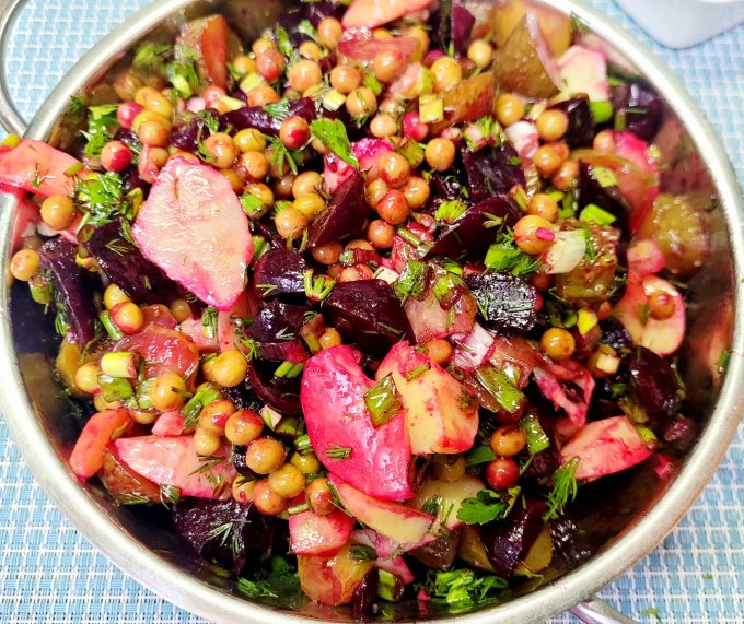 | Винегрет, свекла, огурец, картошка, горошек, зелень, масло |
