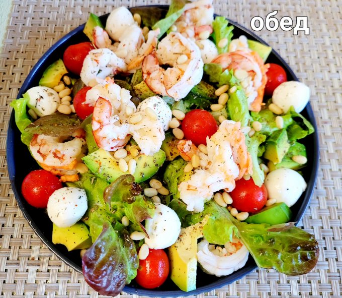 | Салат, авокадо, черри, моцарелла, аргентинские креветки, кедровые орехи, лимонный сок, итальянские травы |