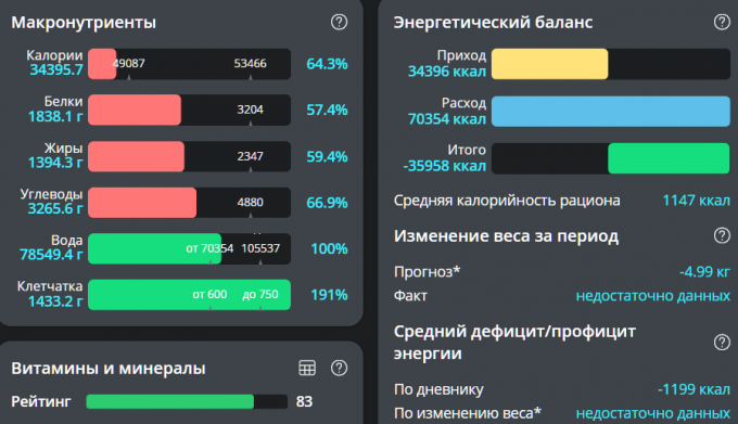 табличные значения нутриентов, и я не вносил данных о двигательной